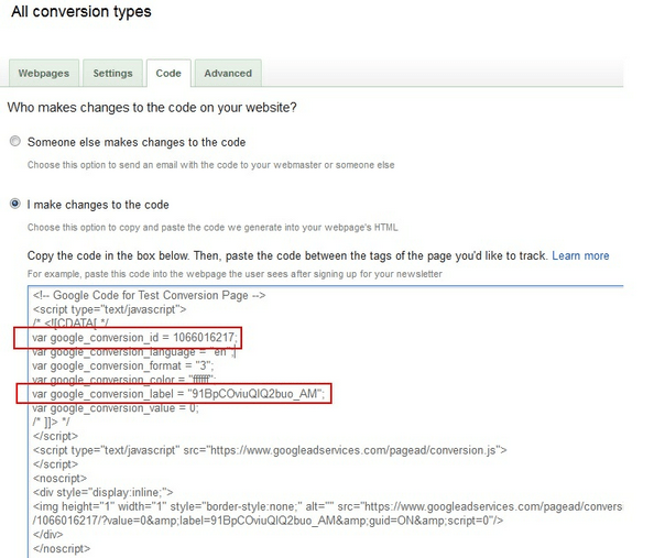 - After you create a new conversion, you can find the Conversion Label and Conversion ID in the code.